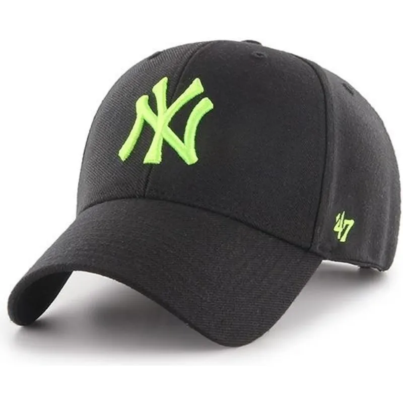 Schwarze Snapback-Cap mit gebogenem Schirm und grünem New York Yankees MLB-Logo von 47 Brand MVP